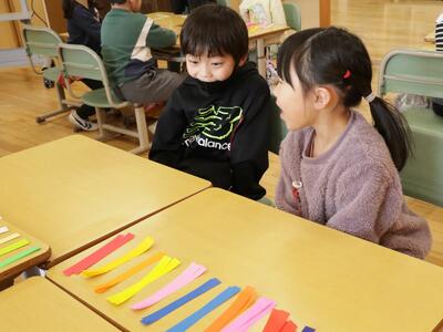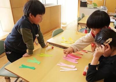 1年1組は,『新一年生の教室』を飾る「輪飾り」を作る準備をしていました。その後,のりで貼る人,つなぐ人など班で分担しました。カラフルな「輪飾り」になりそうです。
