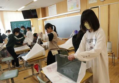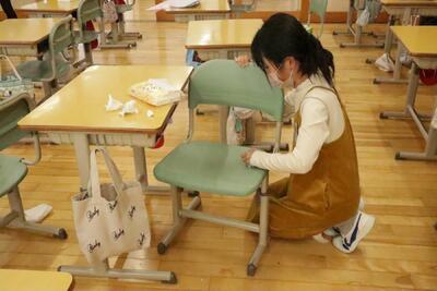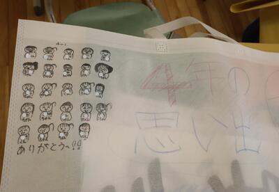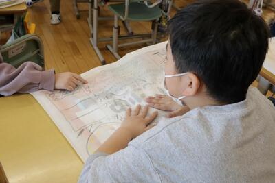 4年1組は,教室に掲示してある作品の整理をしていました。大きな収納袋に作品をまとめていました。収納袋には,いろんな絵が描かれていました。友達の絵を指さしながら,「これ,いいね。」という声が聞こえてきました。
