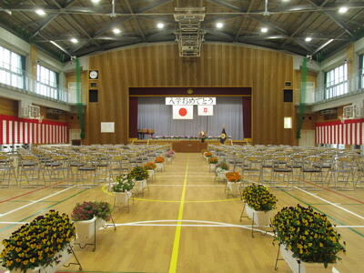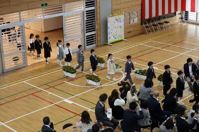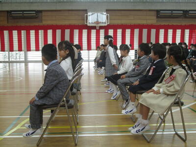 新入生の皆さん,保護者の皆様,ご入学おめでとうございます。5,6年生が,温かく新入生を迎える中,体育館で入学式が行われました。