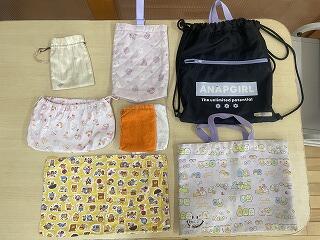 新入生保護者の皆様へ 投稿: 作成者 (15:54) 学用品・PTA販売小物の見本写真について1月28日(水)に開催されました新入生保護者会では、諸事情により予定していた小物類の展示ができませんでした。 当日、実物をご覧いただけなかった皆様のために、PTAより参考の学用品の見本写真(巾着、手提げバック、コップ袋、ナフキン、ミニタオル(曜日毎で色分け)、シューズ袋)を掲載いたします。 お子様のご入学準備の参考になさってください。